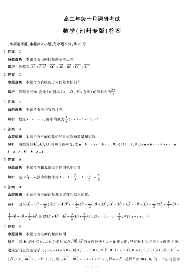 数学池州专版 安徽高二年级十月调研考试答案.pdf