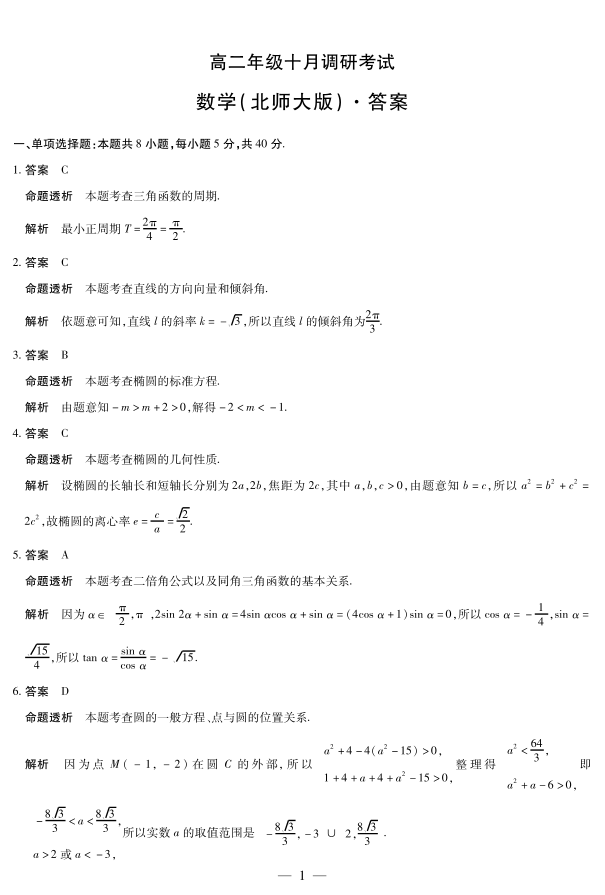 数学北师大版 安徽高二年级十月调研考试答案.pdf
