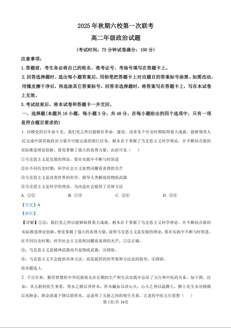河南省南阳市六校2025-2026学年高二上学期第一次联考 政治答案.docx