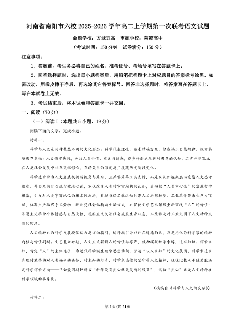 河南省南阳市六校2025-2026学年高二上学期第一次联考 语文答案.docx