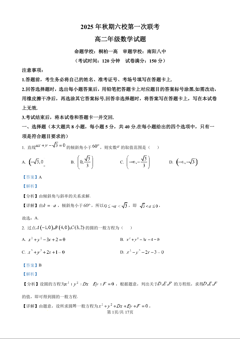 河南省南阳市六校2025-2026学年高二上学期第一次联考 数学答案.docx