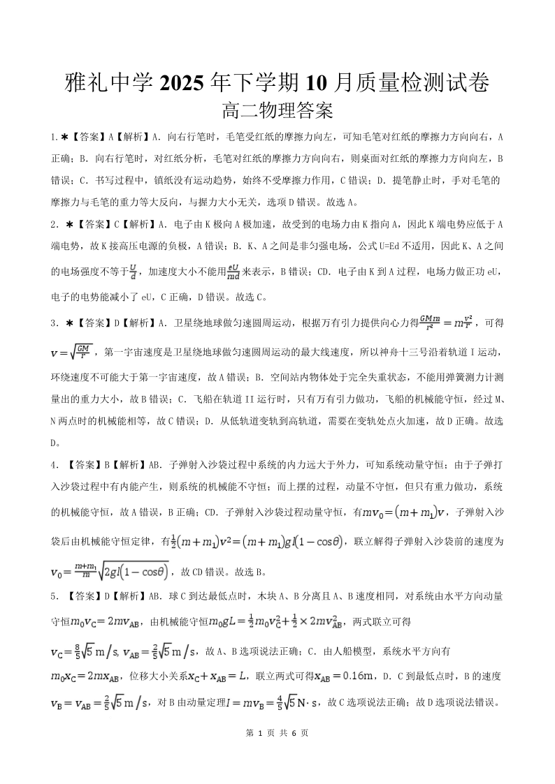 湖南省长沙市雅礼中学2025年下学期高二上学期第一次月考考试 物理答案.pdf