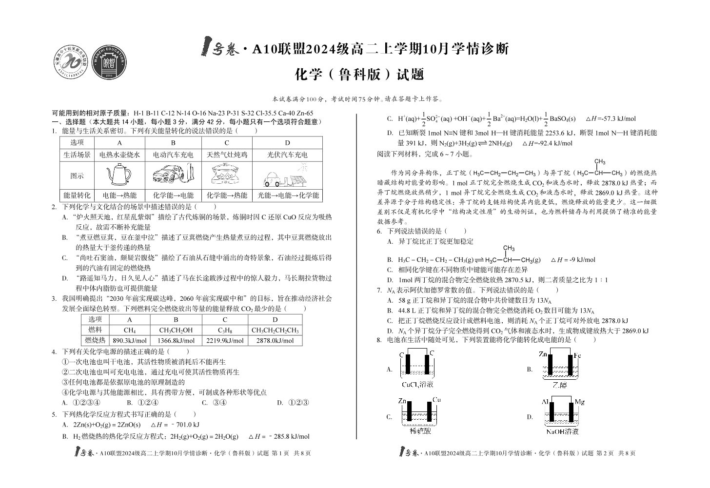 1号卷·A10联盟2024级高二上学期10月学情诊断 化学(鲁科版).pdf
