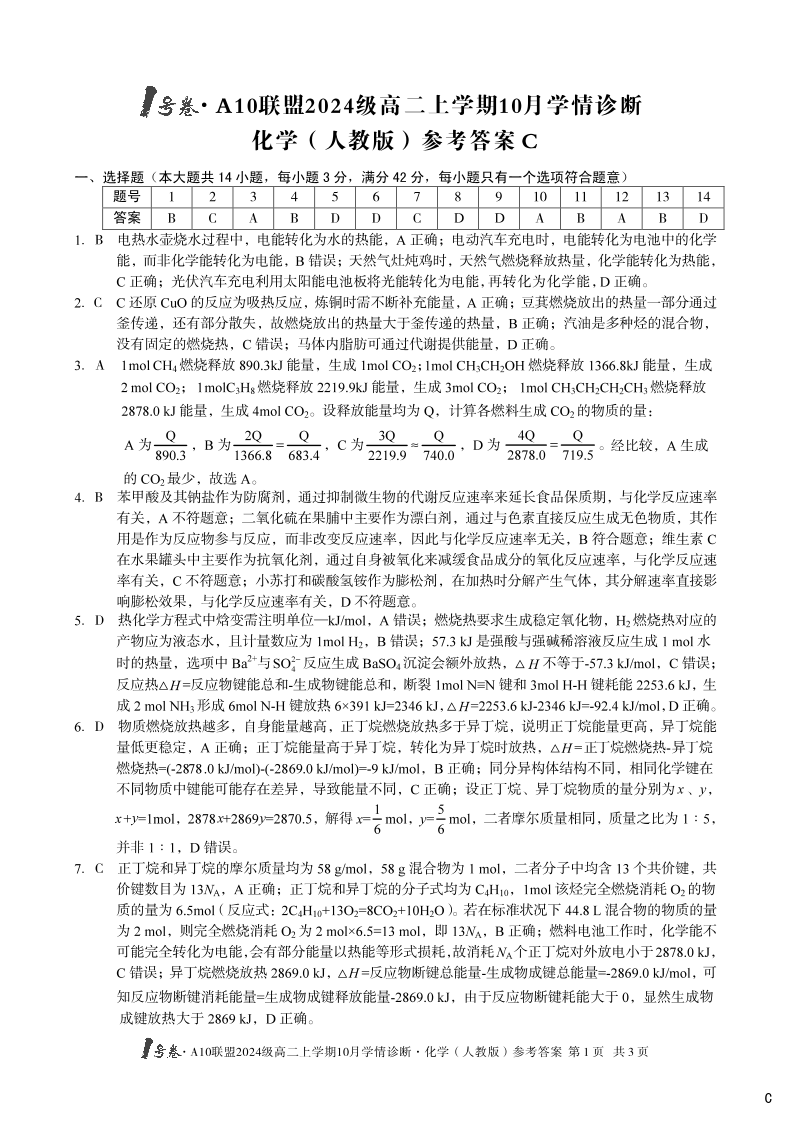 (C卷)1号卷·A10联盟2024级高二上学期10月学情诊断 化学(人教版)答案c.pdf