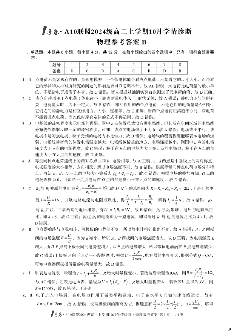 (B卷)1号卷·A10联盟2024级高二上学期10月学情诊断物理答案B.pdf