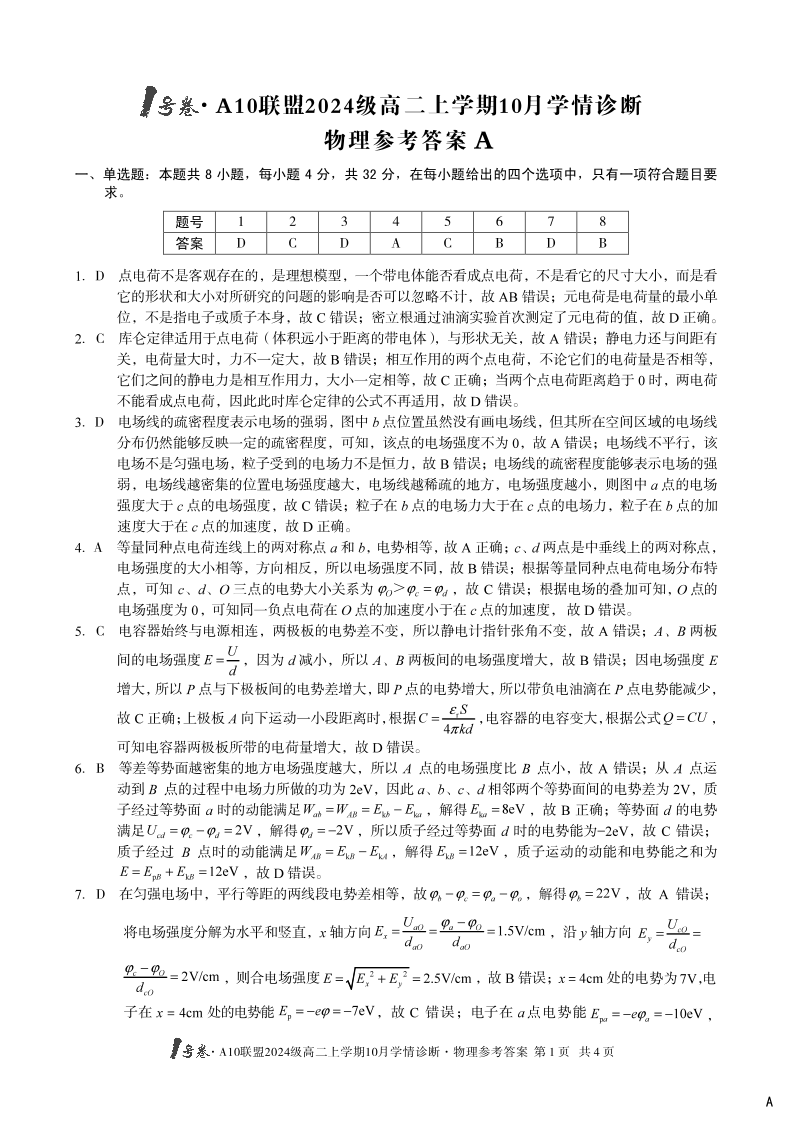 (A卷)1号卷·A10联盟2024级高二上学期10月学情诊断 物理答案A.pdf