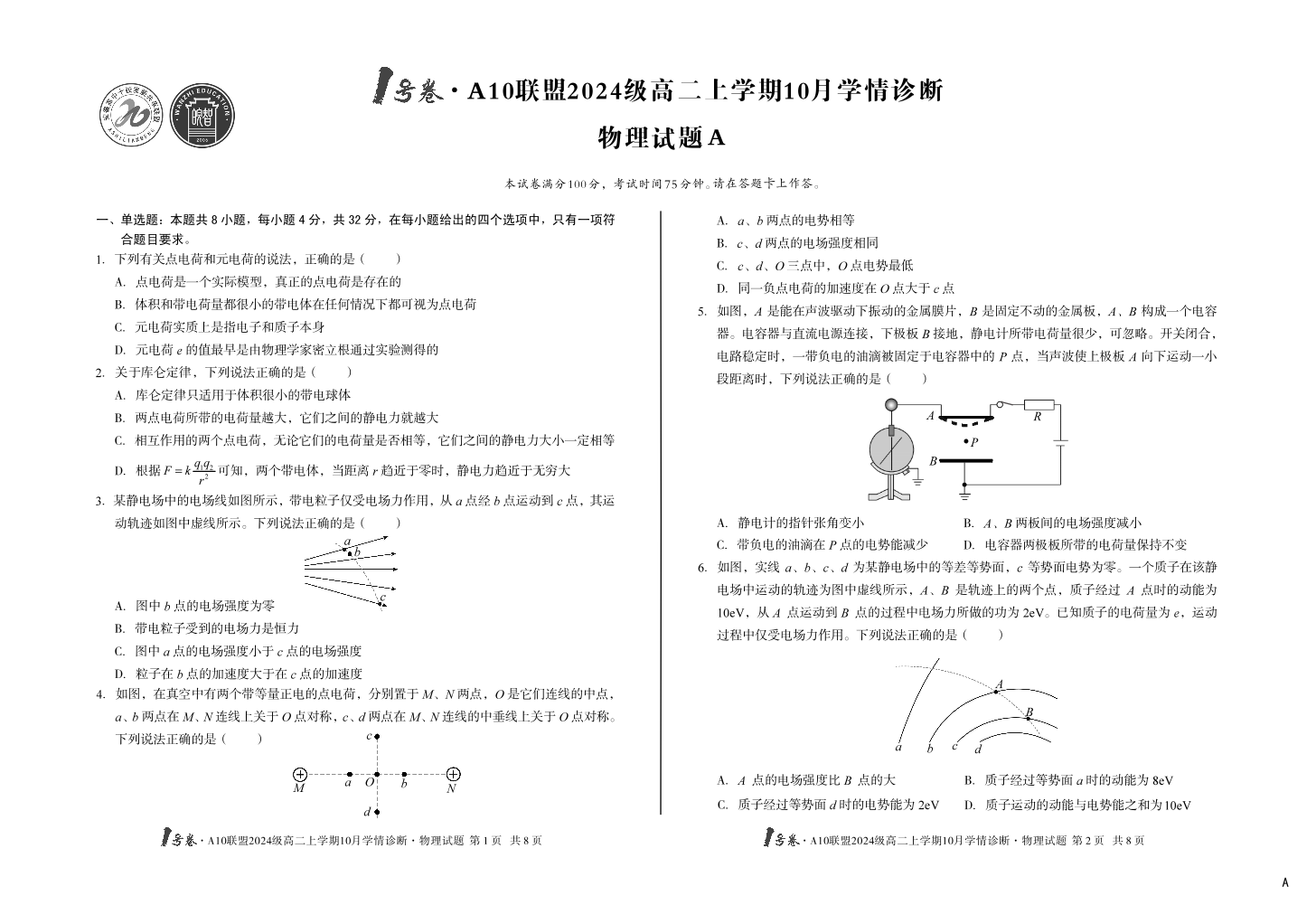 (A卷)1号卷·A10联盟2024级高二上学期10月学情诊断 物理A.pdf