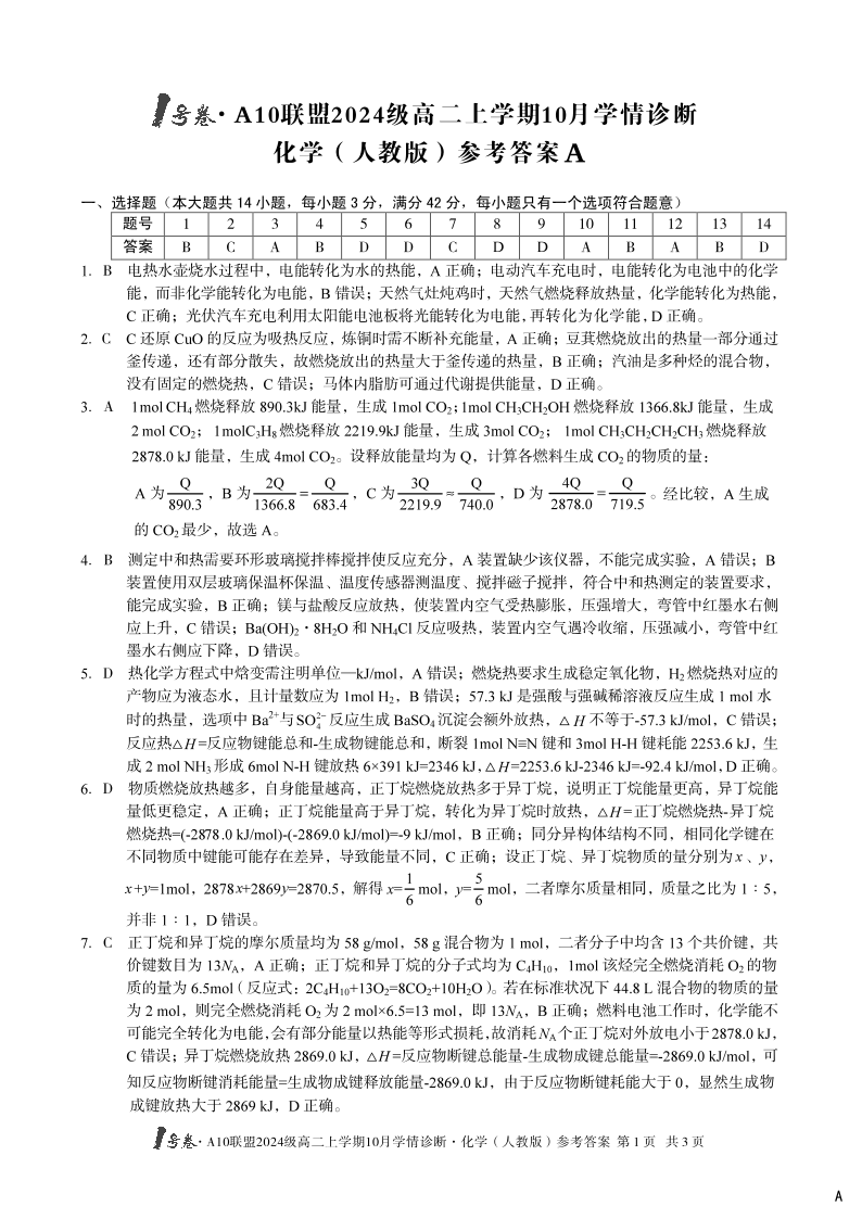 (A卷)1号卷·A10联盟2024级高二上学期10月学情诊断 化学(人教版)答案A.pdf
