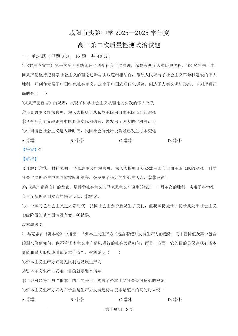 陕西省咸阳市实验中学2026届高三上学期第二次质量检测 政治答案.docx