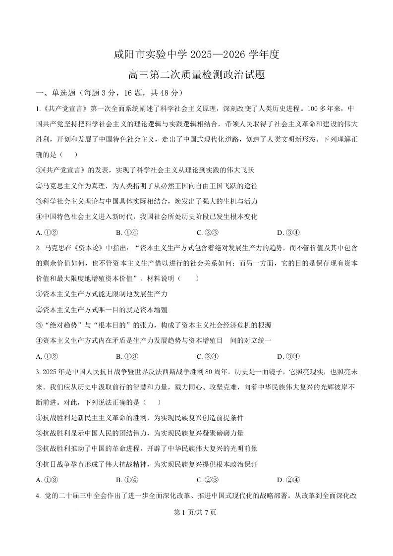 陕西省咸阳市实验中学2026届高三上学期第二次质量检测 政治.docx