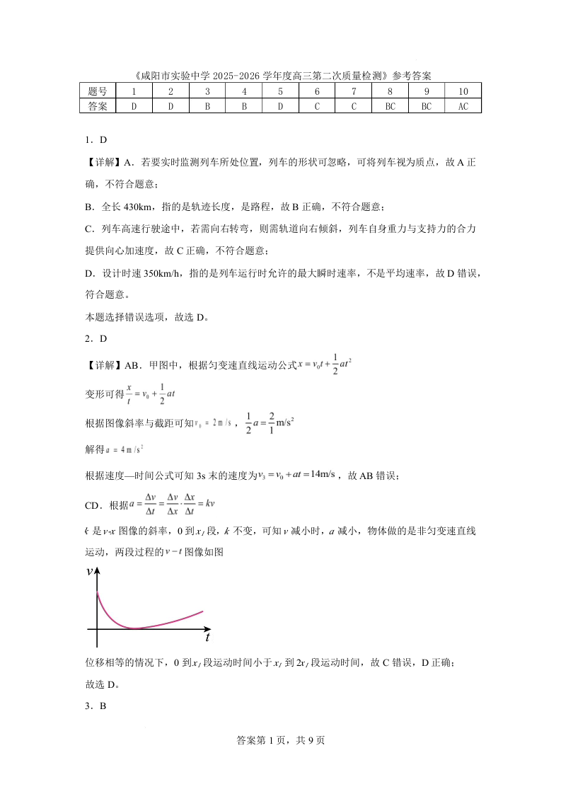 陕西省咸阳市实验中学2026届高三上学期第二次质量检测 物理答案.docx