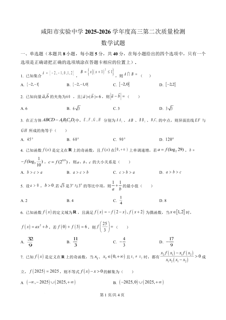 陕西省咸阳市实验中学2026届高三上学期第二次质量检测 数学.docx