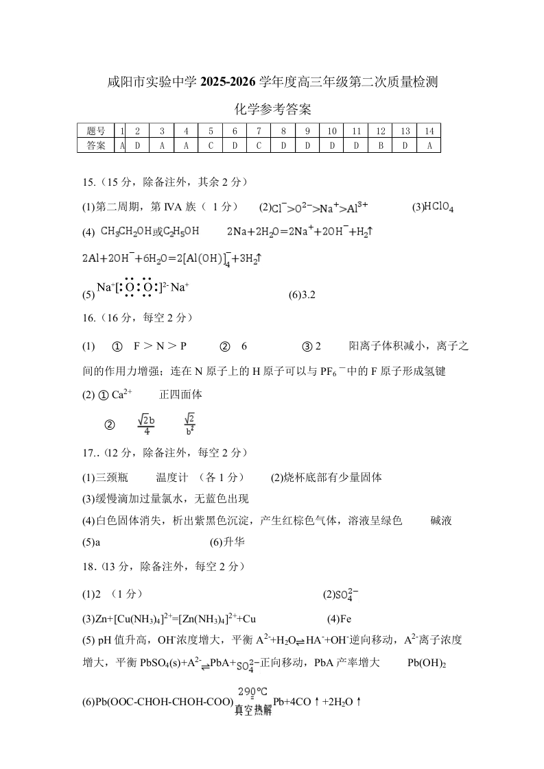 陕西省咸阳市实验中学2026届高三上学期第二次质量检测 化学答案.docx
