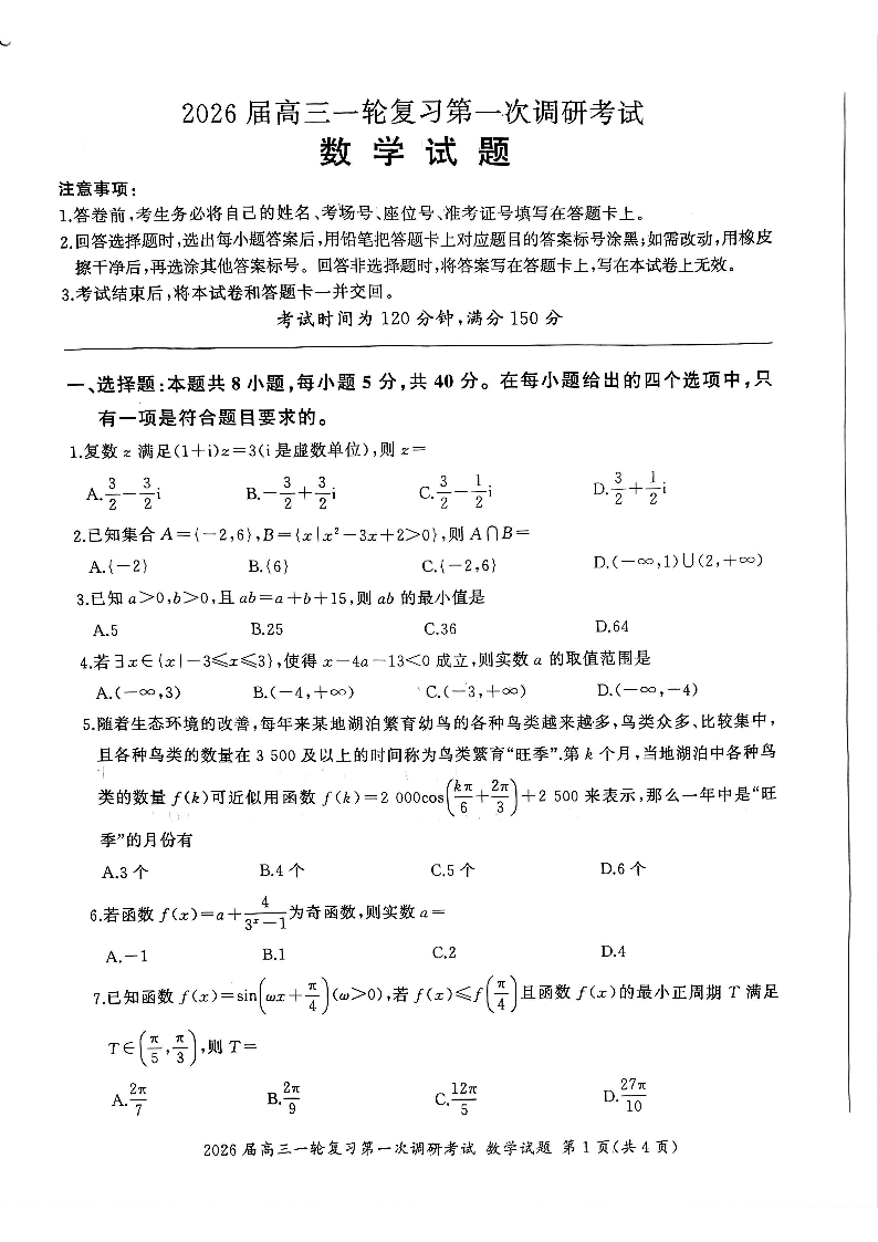 四川省百师联盟2026届高三一轮复习第一次调研考试 数学.pdf