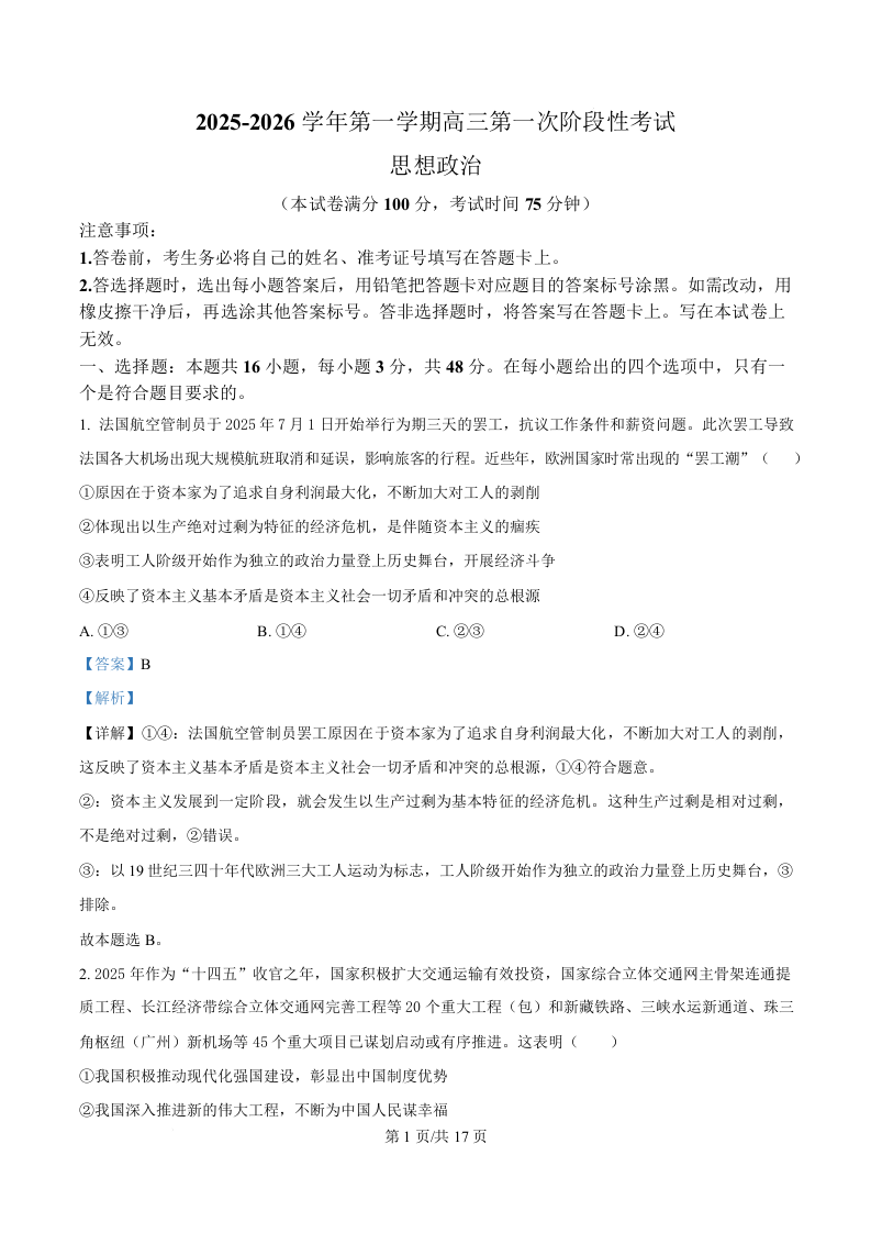 渤海大学附属高级中学2026届高三上学期第一次月考 政治答案.docx