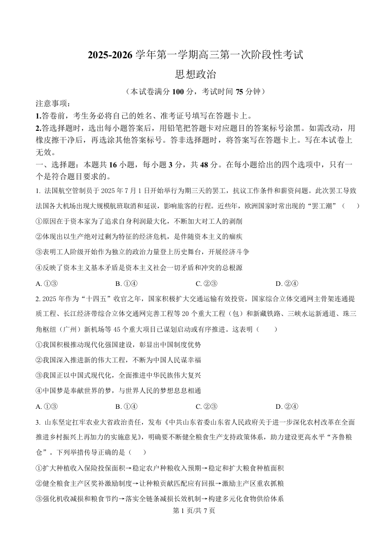 渤海大学附属高级中学2026届高三上学期第一次月考 政治.docx