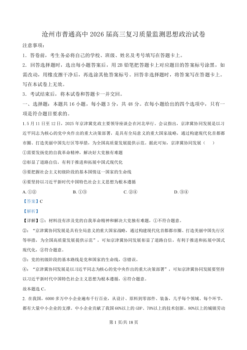 河北省沧州市普通高中2026届高三复习质量检测 政治答案.docx