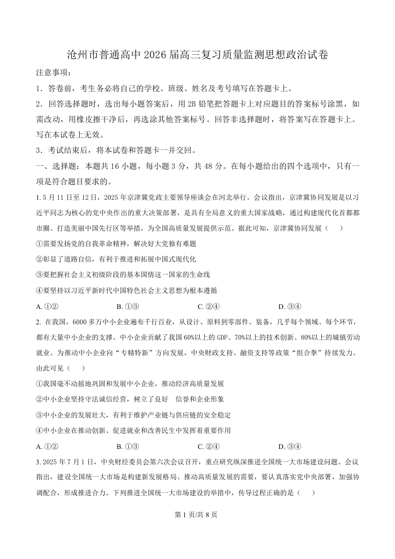 河北省沧州市普通高中2026届高三复习质量检测 政治.docx