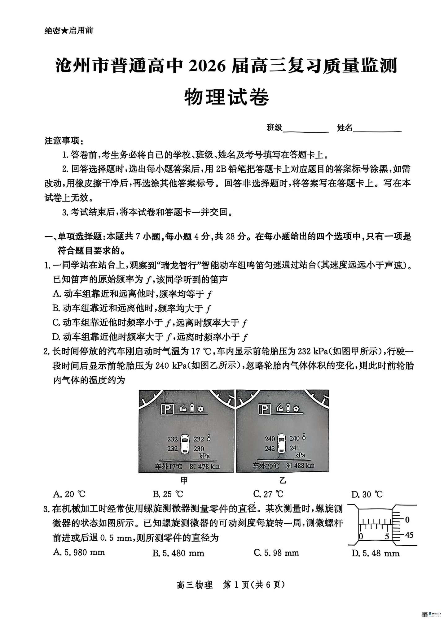 河北省沧州市普通高中2026届高三复习质量检测 物理.pdf