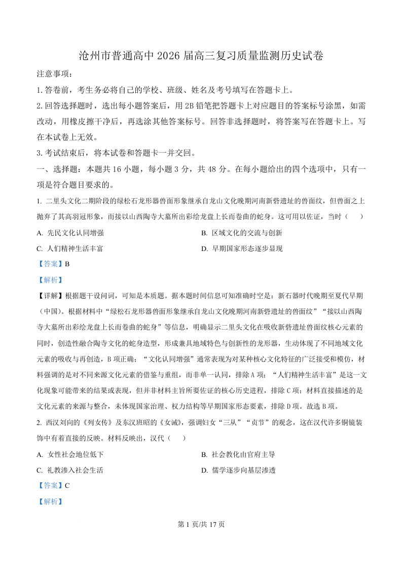 河北省沧州市普通高中2026届高三复习质量检测 历史答案.docx