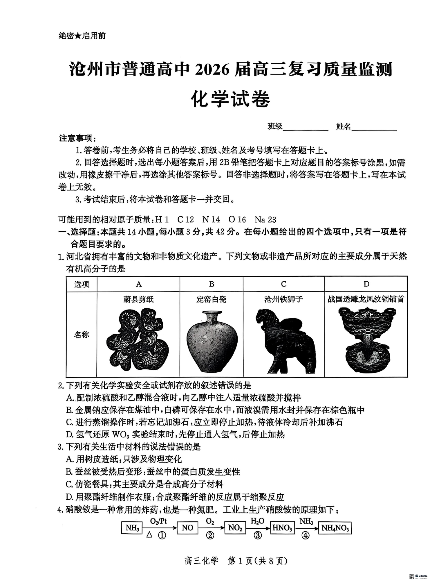 河北省沧州市普通高中2026届高三复习质量检测 化学.pdf