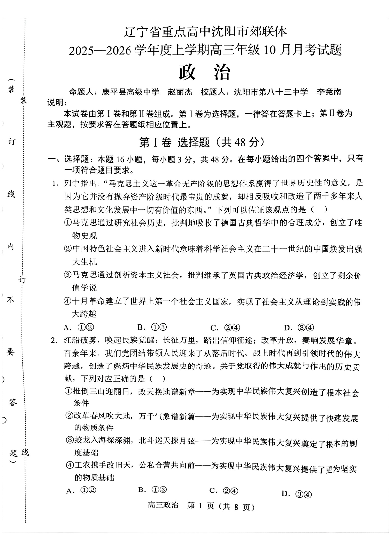 辽宁省重点高中沈阳市郊联体2026届高三年级10月月考 政治试题(含答案).pdf