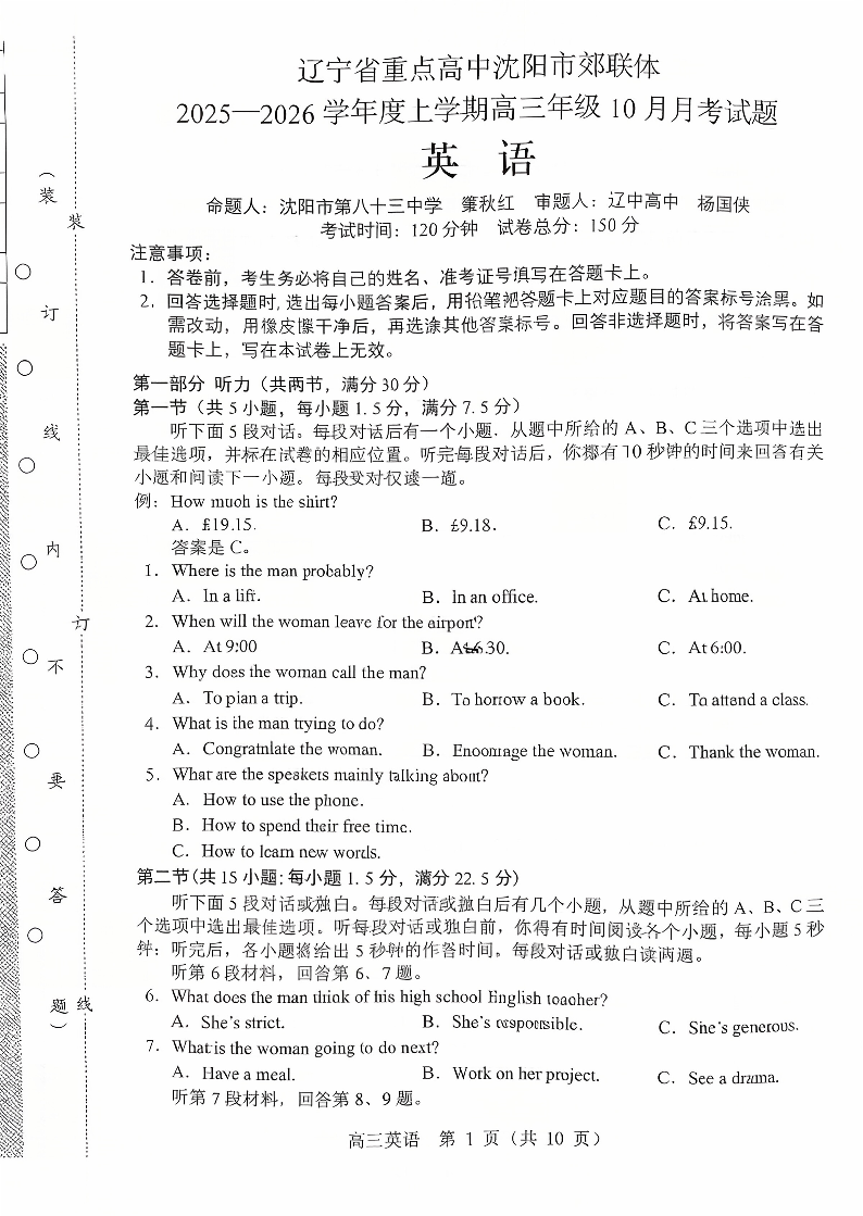 辽宁省重点高中沈阳市郊联体2026届高三年级10月月考 英语试题(含答案).pdf