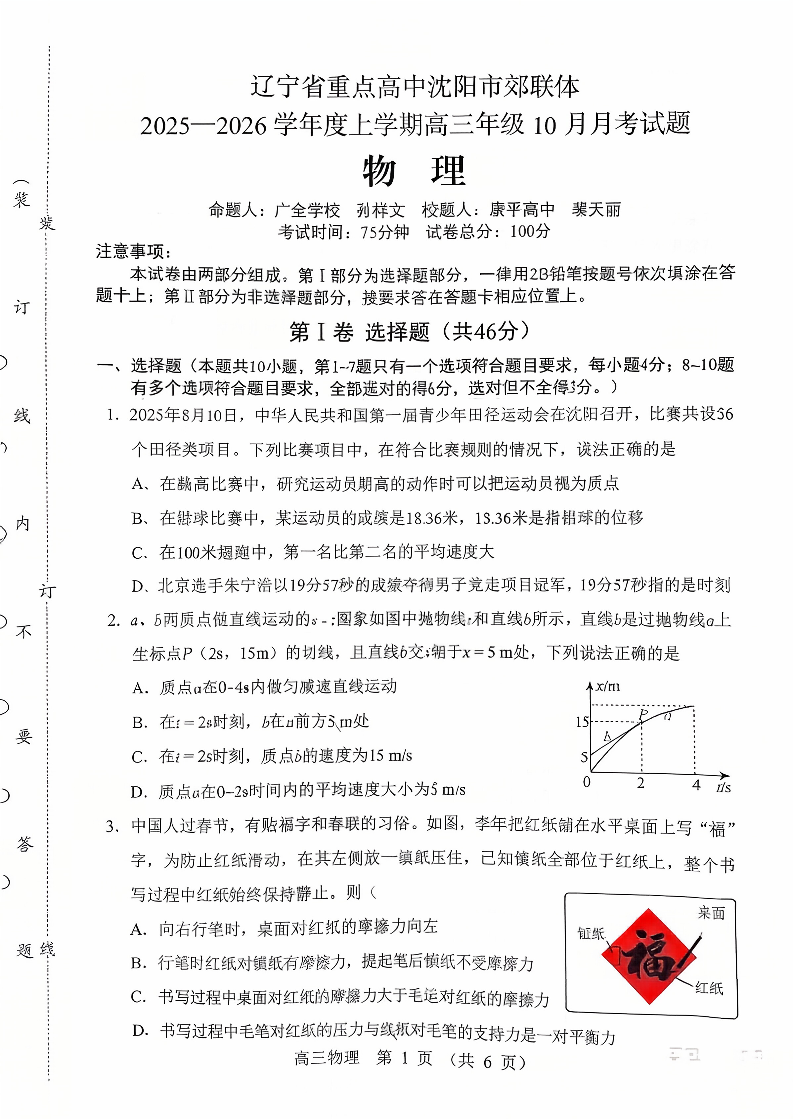 辽宁省重点高中沈阳市郊联体2026届高三年级10月月考 物理试题(含答案).pdf
