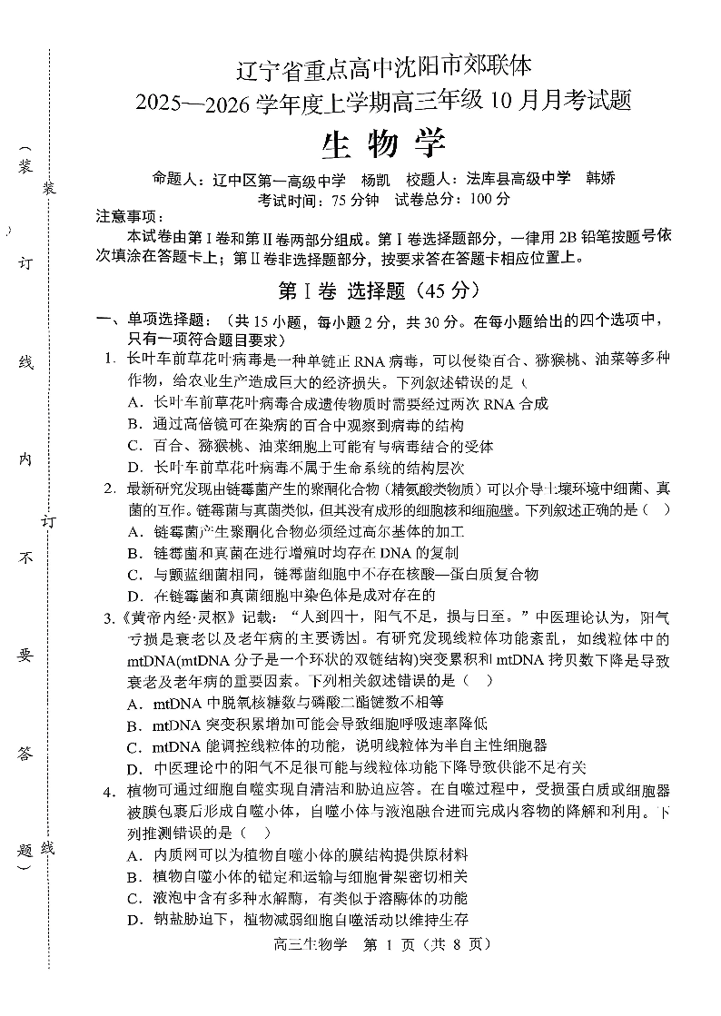 辽宁省重点高中沈阳市郊联体2026届高三年级10月月考 生物试题(含答案).pdf