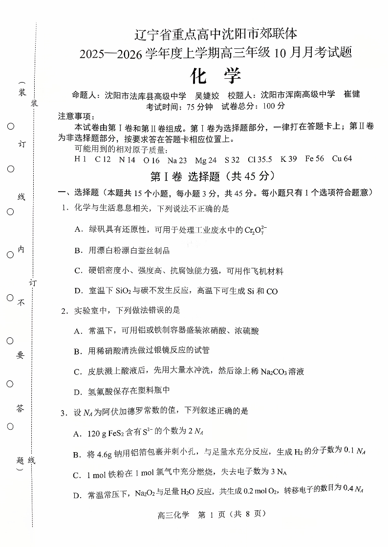 辽宁省重点高中沈阳市郊联体2026届高三年级10月月考 化学试题(含答案).pdf