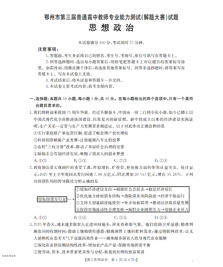 鄂州市2026届高三上学期第三届普通高中教师专业能力测试(解题大赛) 政治.pdf