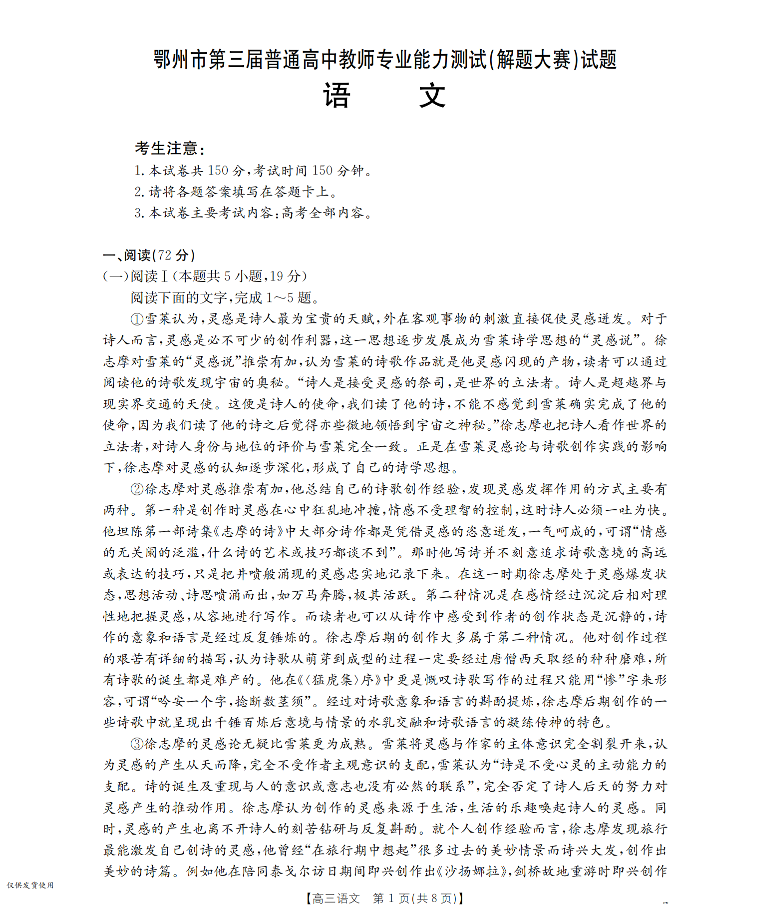 鄂州市2026届高三上学期第三届普通高中教师专业能力测试(解题大赛) 语文.pdf