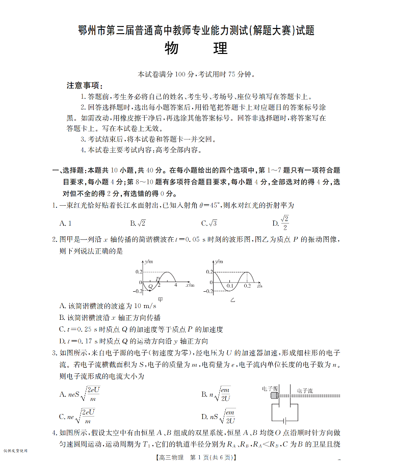 鄂州市2026届高三上学期第三届普通高中教师专业能力测试(解题大赛) 物理.pdf
