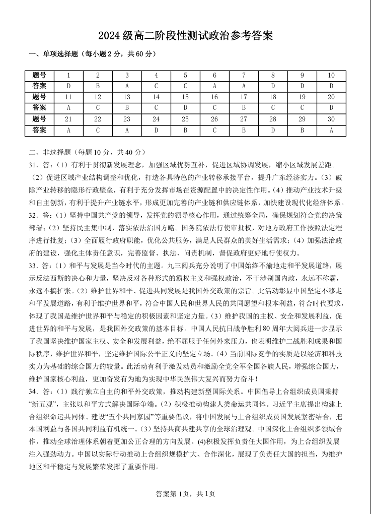 汕头市金山中学2024级高二第一学期阶段考试 政治答案.docx