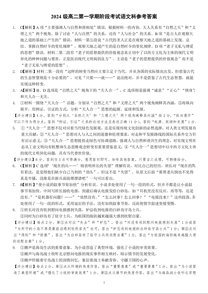 汕头市金山中学2024级高二第一学期阶段考试 语文答案.docx