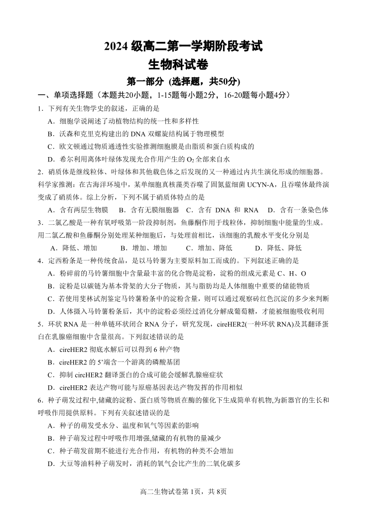 汕头市金山中学2024级高二第一学期阶段考试 生物.pdf