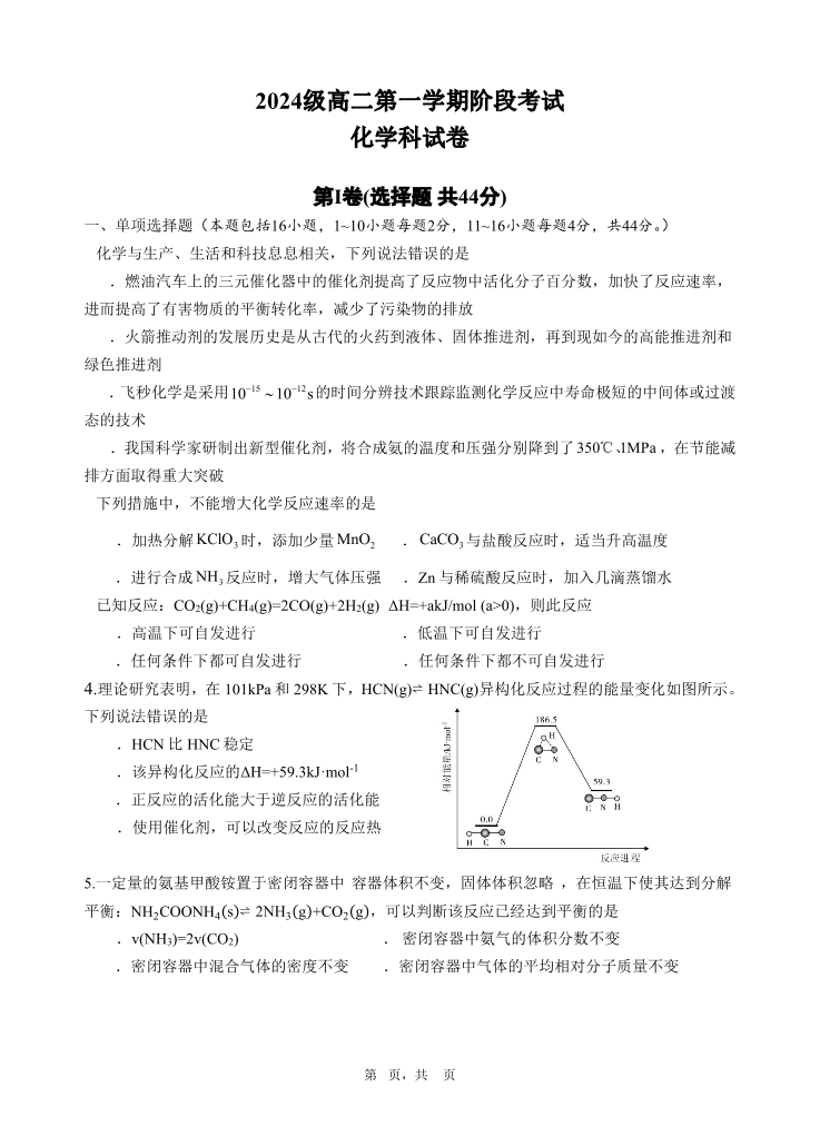 汕头市金山中学2024级高二第一学期阶段考试 化学.pdf