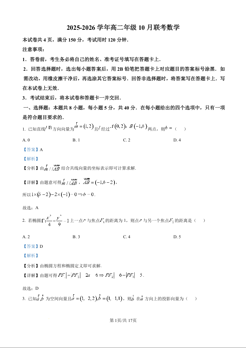 河北省保定市部分示范高中2025-2026学年高二年级10月月考 数学答案.docx