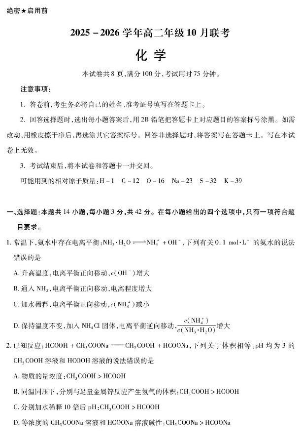 河北省保定市部分示范高中2025-2026学年高二年级10月月考 化学.pdf