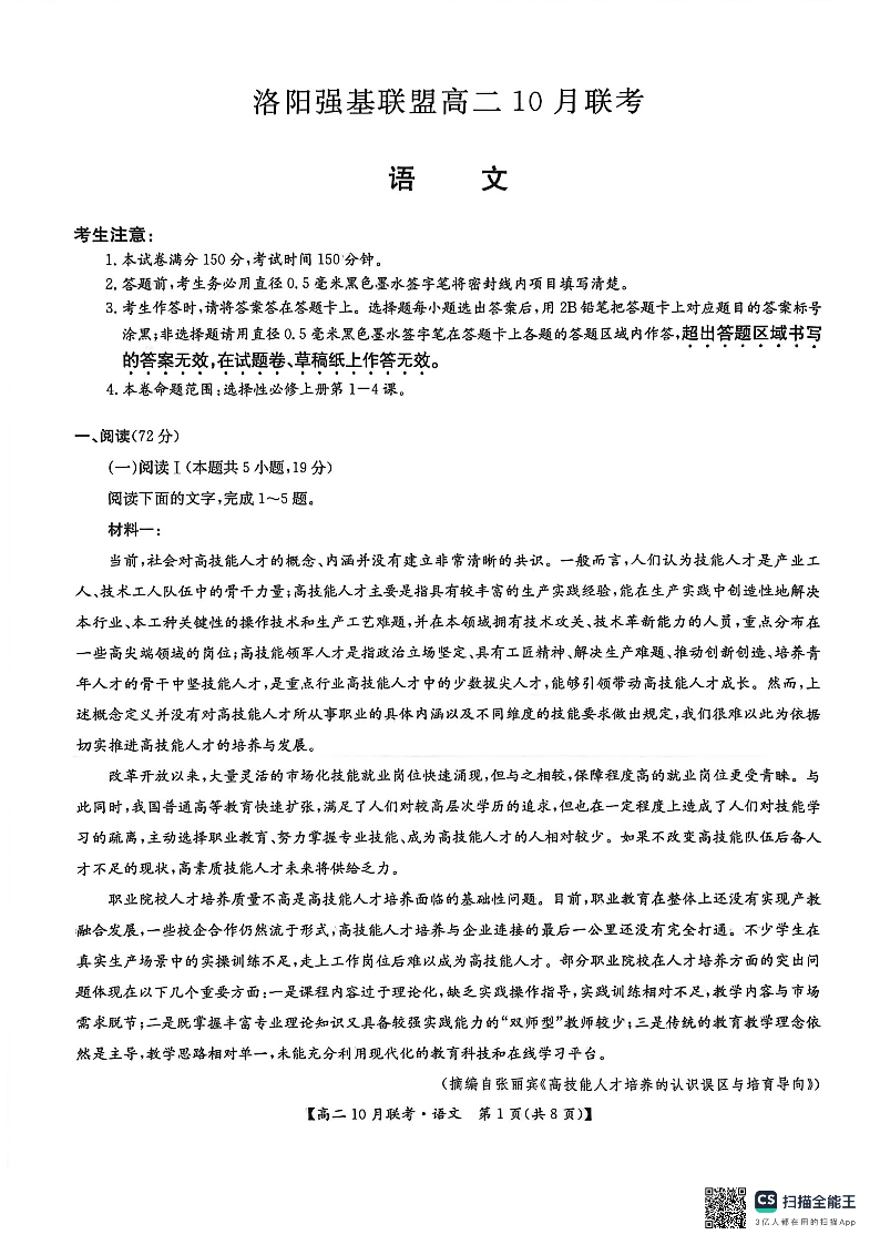 河南洛阳强基联盟2025-2026学年高二上学期10月联考 语文试题(含答案).pdf