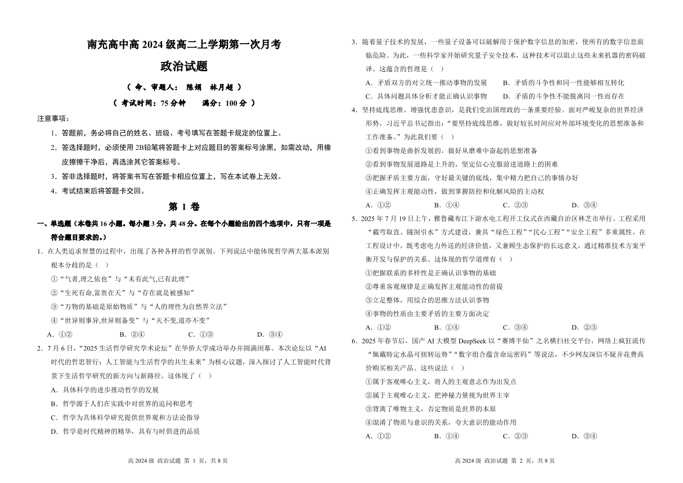 南充高中高2024级高二上学期第一次月考 政治.pdf