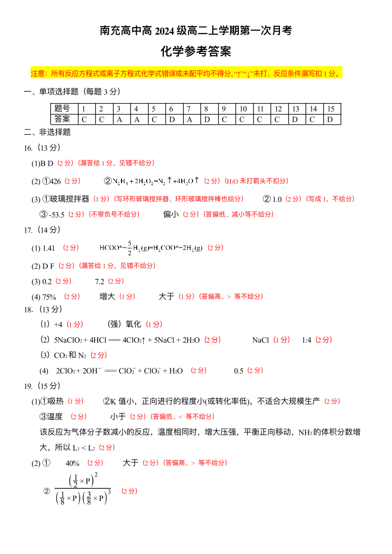 南充高中高2024级高二上学期第一次月考 化学答案.pdf