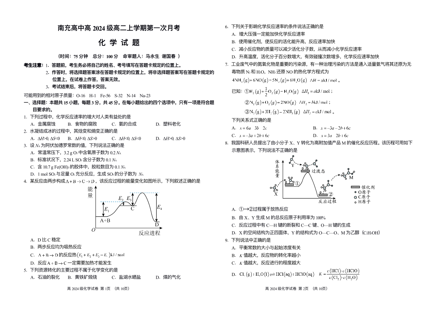 南充高中高2024级高二上学期第一次月考 化学.pdf