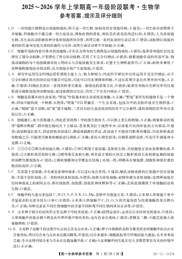 安徽省江淮名校2025-2026学年高一上学期10月阶段联考 生物答案.pdf