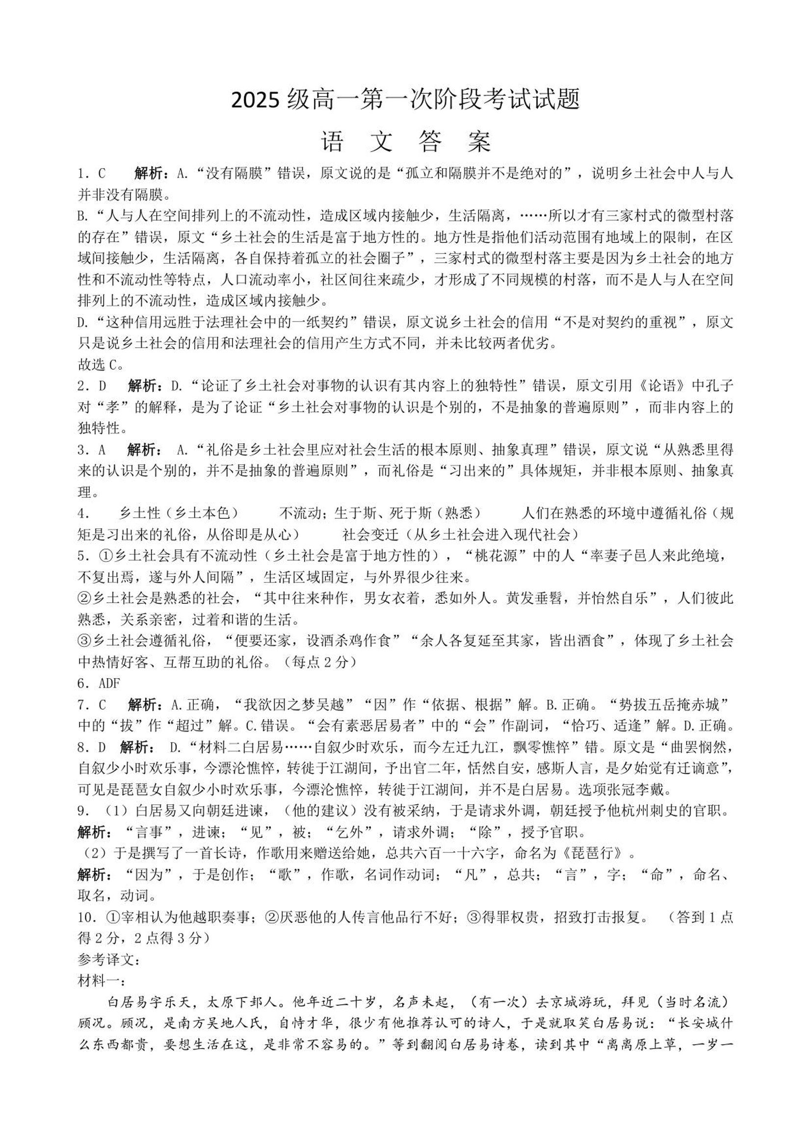 湖南省岳阳县第一中学2025-2026学年高一上学期第一次月考 语文答案.pdf