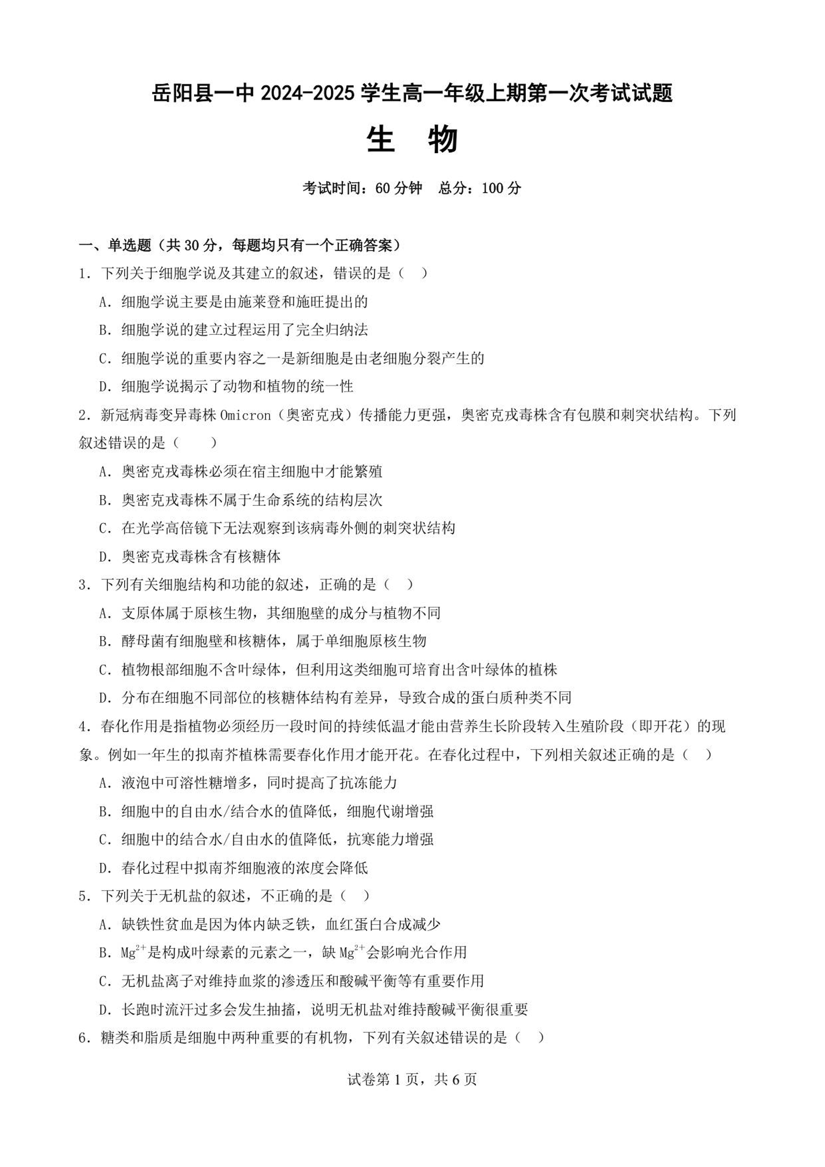 湖南省岳阳县第一中学2025-2026学年高一上学期第一次月考 生物.pdf