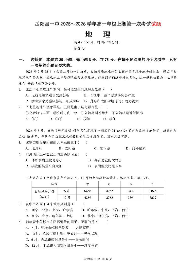 湖南省岳阳县第一中学2025-2026学年高一上学期第一次月考 地理.pdf