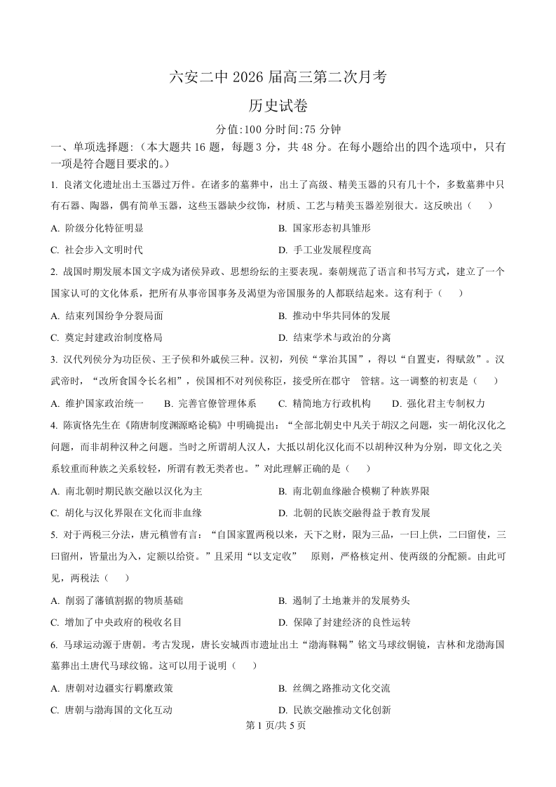 安徽省六安第二中学2026届高三上学期第二次月考 历史.docx