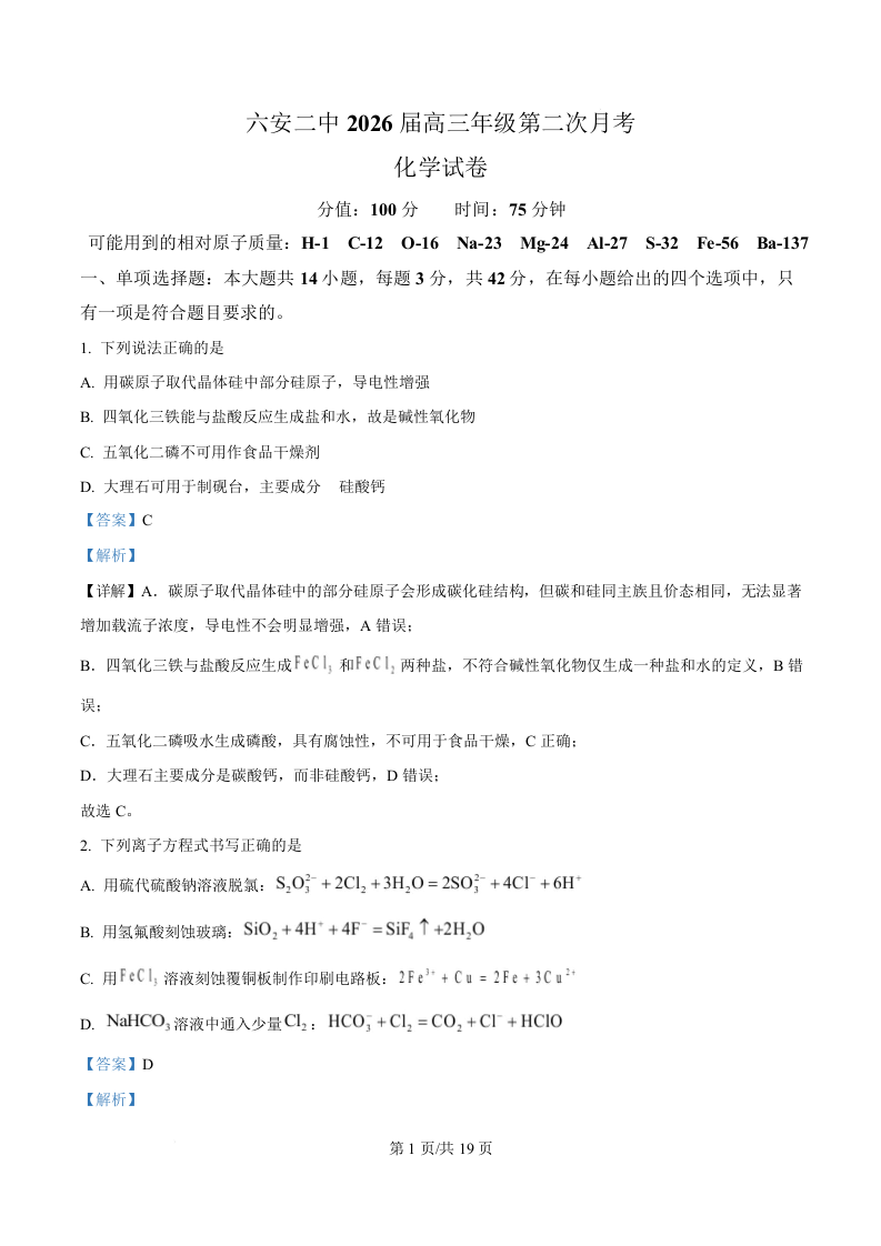 安徽省六安第二中学2026届高三上学期第二次月考 化学答案.docx