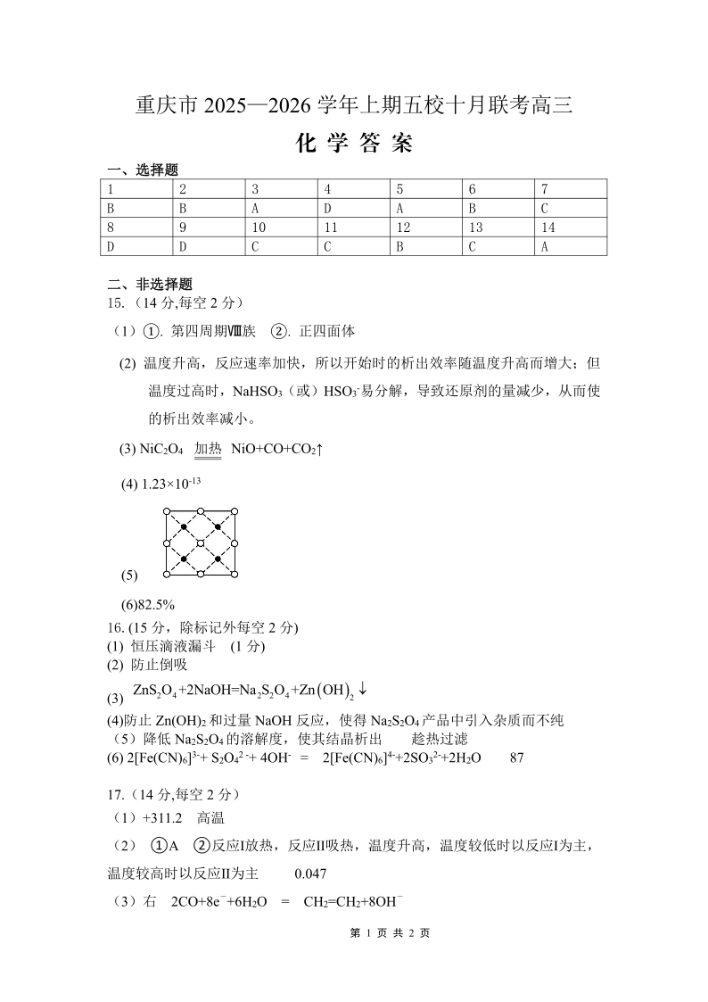 2025-2026学年上期五校十月联考 化学答案.pdf